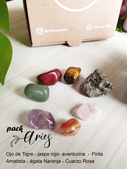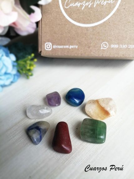 Son diez piedritas: Jaspe Rojo, Fluorita, Ágata, Obsidiana, Turmalina, Cuarzo Rosa, Citrino, calcita naranja , Cuarzo Cristal y la gran Rodonita.