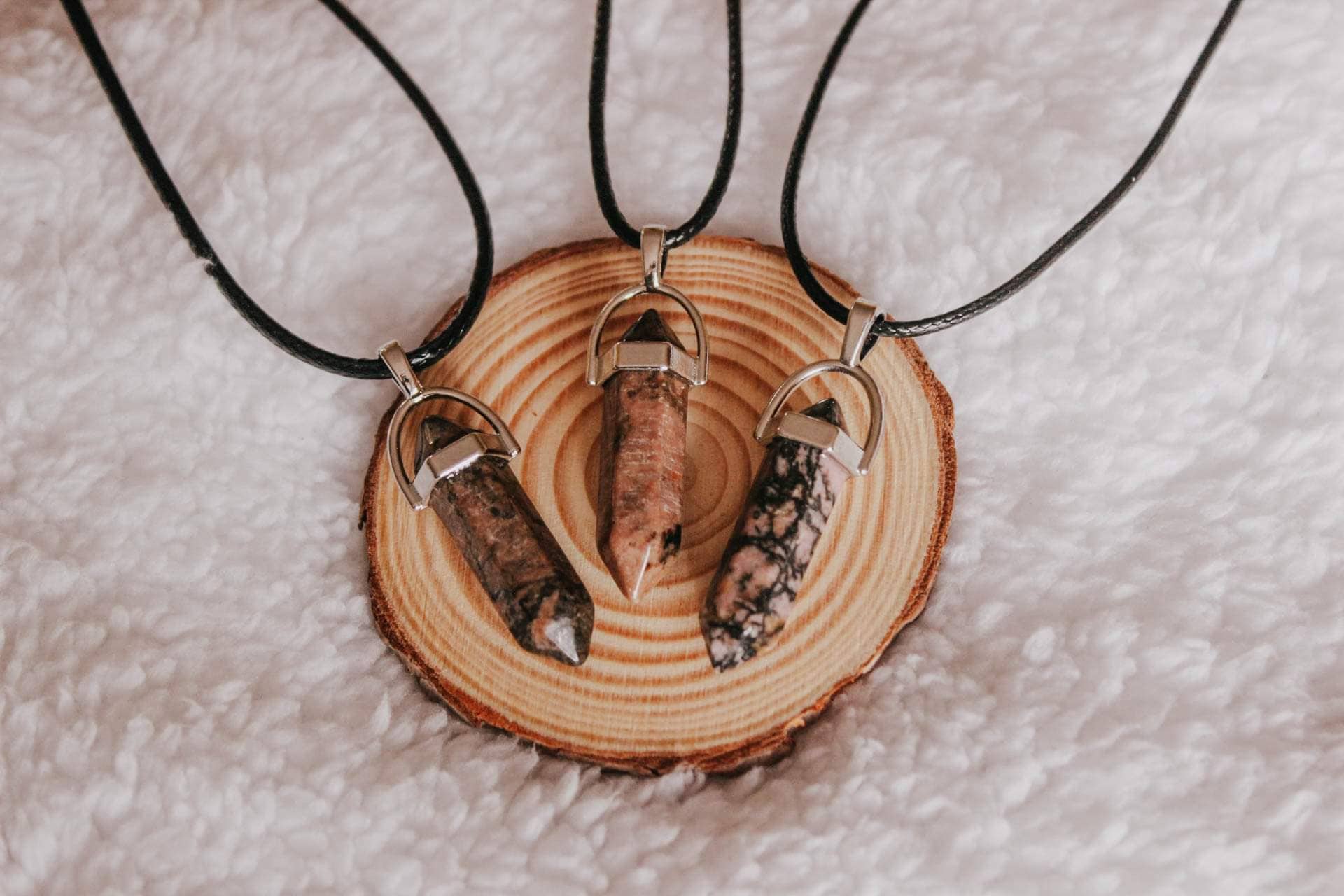 Tags: collar con pita negra, collar de cuarzo, collar hexagonal, collar rodonita, rodonita